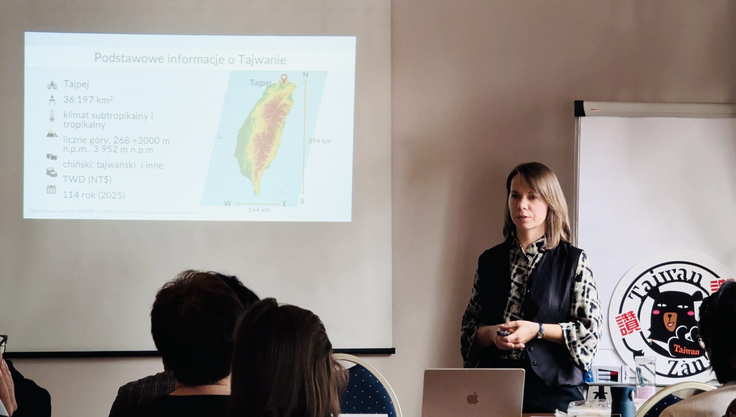 Na początek pani Dorota Kuziów, absolwentka sinologii na Uniwersytecie Warszawskim i współautorka polskiego tłumaczenia podręcznika „Chodźcie! Pouczmy się chińskiego!”, przedstawiła fascynującą prezentację o Tajwanie. Opowiadała o geografii, historii, różnorodności etnicznej, turystyce, kuchni i rozwoju gospodarczym Tajwanu. Wielu uczestników po prezentacji przyznało, że teraz koniecznie chce odwiedzić tę piękną wyspę.