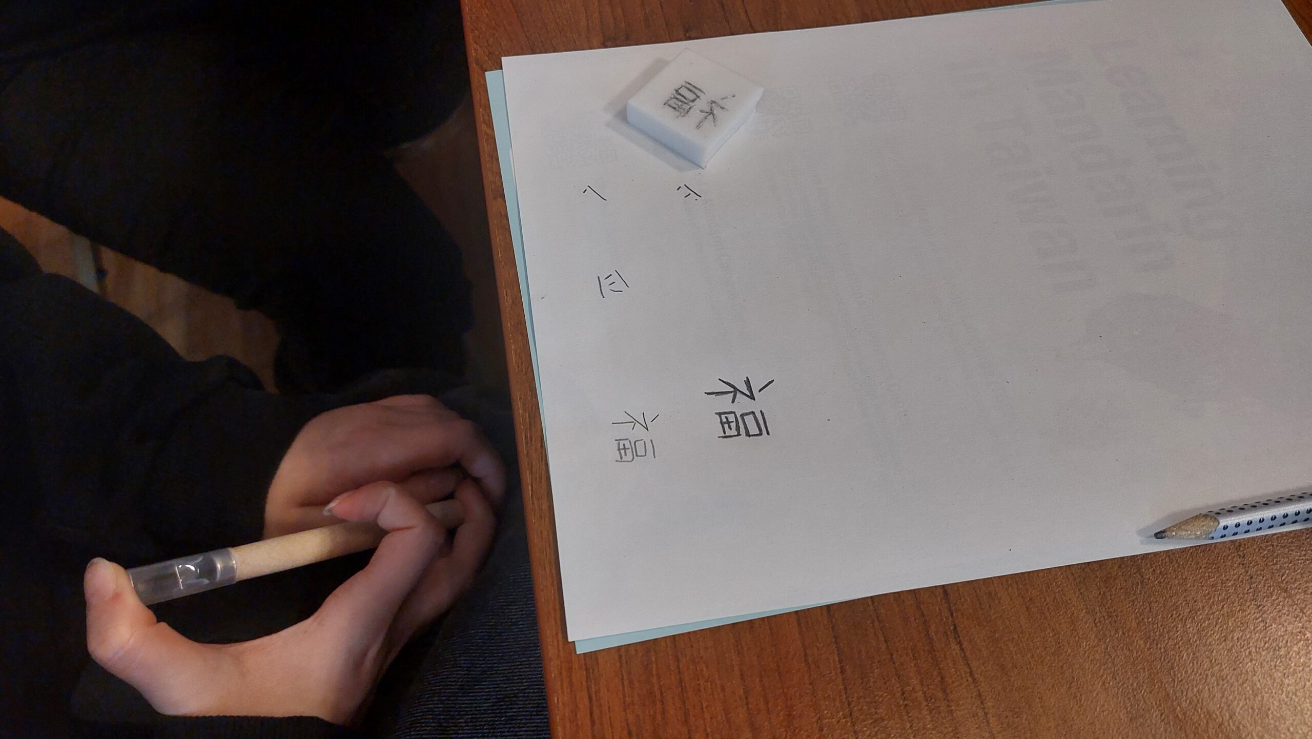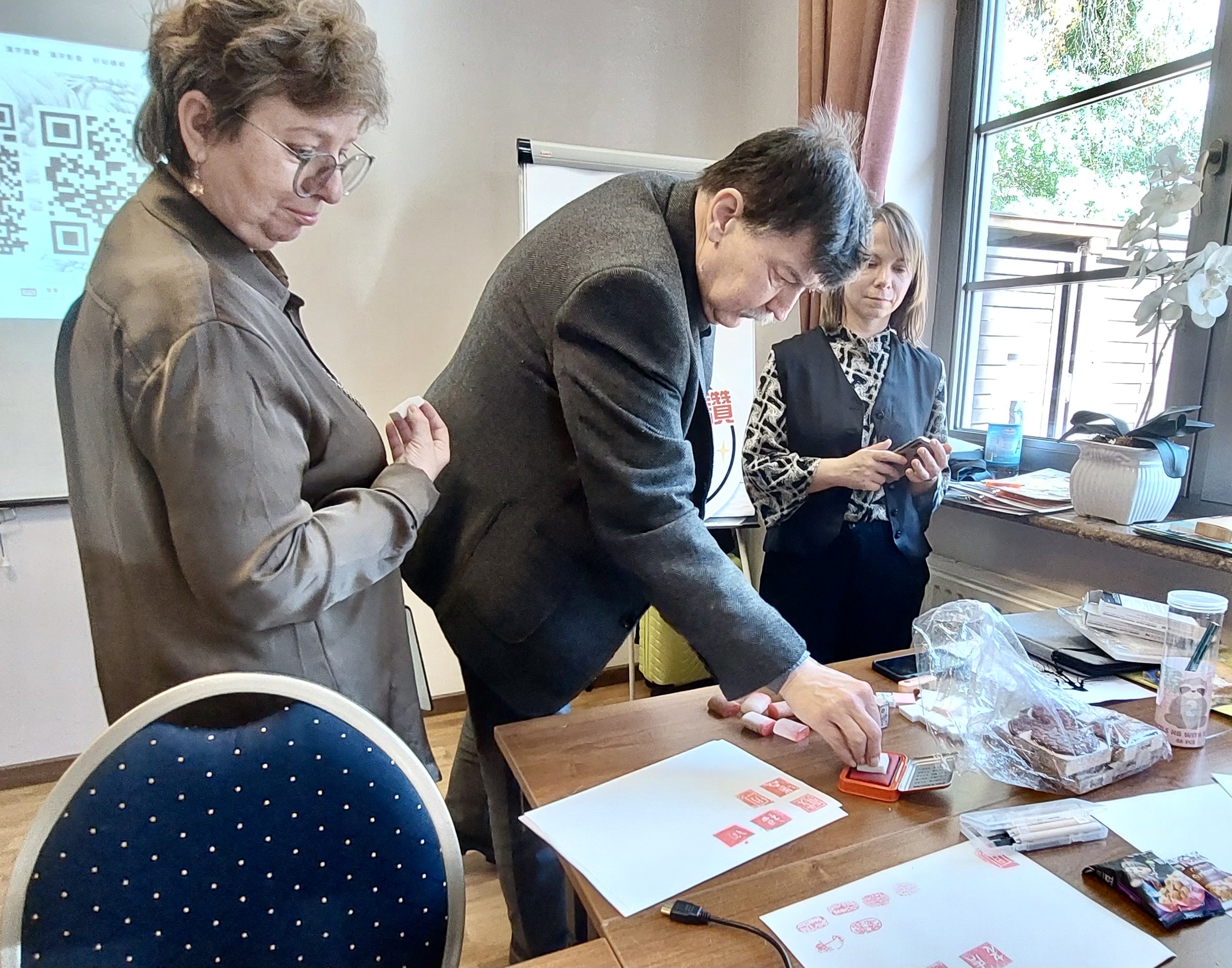 Następnie pan Yu-Hsiang Shen (沈鈺翔老師) poprowadził warsztaty tworzenia pieczęci (篆刻). Uczestnicy poznali ewolucję chińskich znaków – od pisma na kościach wróżebnych po współczesne pismo drukowane – a później własnoręcznie wyryli w gumie wybrane znaki lub swoje chińskie imiona. Niektórzy przynieśli nawet notatniki, by na pamiątkę zebrać odbitki pieczęci innych uczestników.